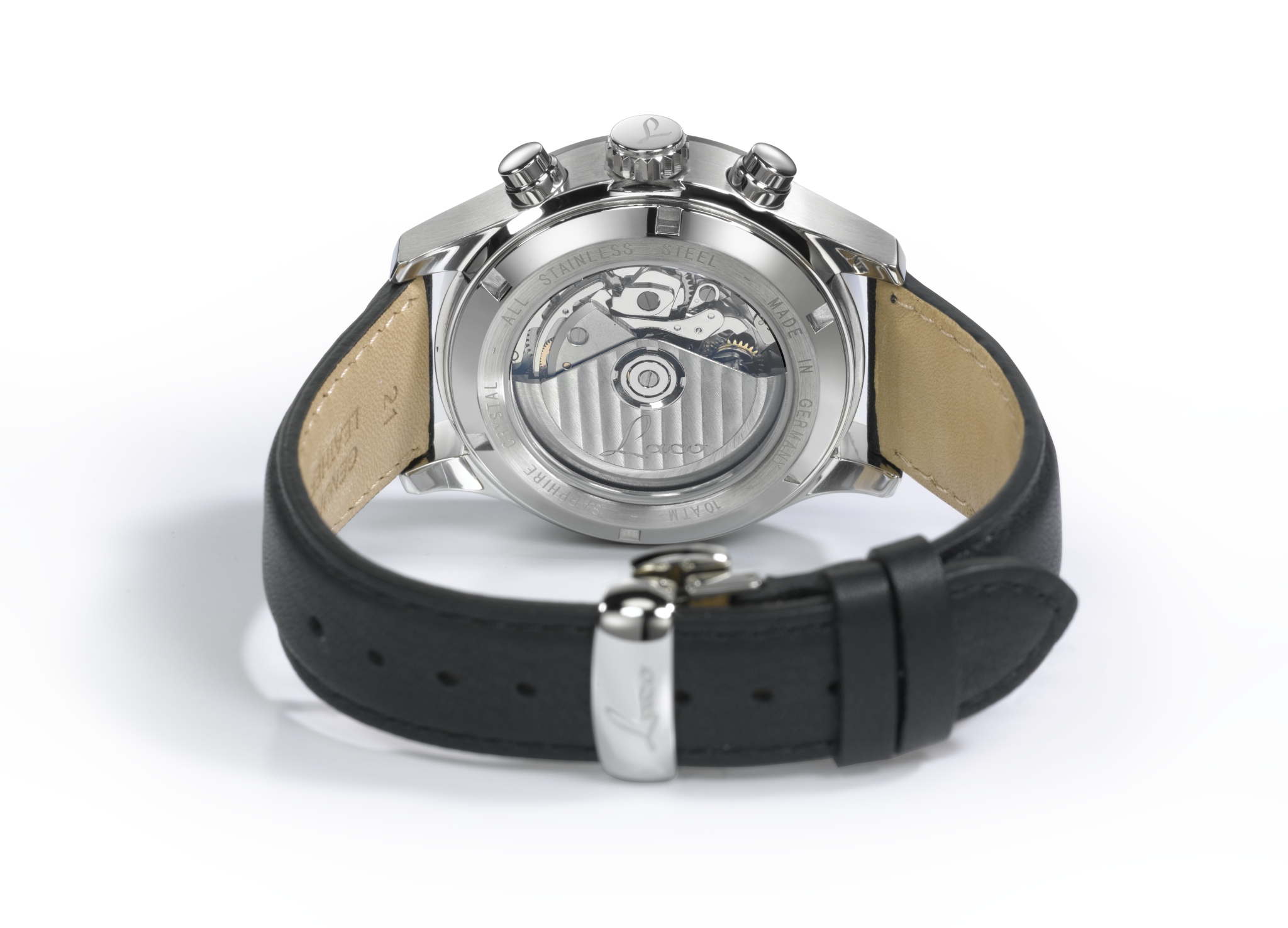 Die Uhr ist mit dem bewährten Chronographenwerk Laco 50 auf der Basis von Valta Valjoux 7750 ausgestattet , das praktische Funktionen zur Anzeige der Standardzeit, des Datums und des Wochentags sowie der Möglichkeit zur Messung der ausgewählten Zeiträume mit der Stoppuhr bietet. Die Bewegung und ihre Funktionsweise sind durch das Glasfenster im unteren Bereich sichtbar.
