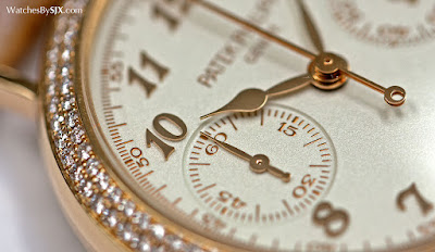 Der Schiedsrichter. 7059 ist ein Single-Button, Split-Sekunden-Chronograph, dh es hat eine Taste zu starten, stoppen und setzen Sie den Chronographen, die auch zwei zentrale Sekunden Zeiger, in der Lage, zwei gleichzeitige Zeiten von bis zu einer Minute zu messen. Trotz der Komplexität der Bewegung ist das Gesicht der Uhr sauber und funktional. Das Gegenteil ist jedoch wunderbar aufwendig. Patek Philippe erstes in-house Chronographenwerk Bei seiner Einführung der CHR 27-525 PS - Bewegung war das dünnste Rattrapante-Chronographenwerk auf dem Markt, steht nur 5,25 mm hoch (es ist seit der verdrängten wurde Vacheron Constantin Kaliber 3500 durch eine bloße 0,05 mm). Aber die Bewegung in der Ref. 7059 ist auch bemerkenswert, weil es die erste Chronographenbewegung war, die von Patek Philippe selbst entwickelt und hergestellt wurde. Für alle seine glorreiche, jahrhundertealte Geschichte der Chronographen Armbanduhren , Patek Philippe stützte sich auf externe Lieferanten für Bewegungs-Leerzeichen, bis 2005.